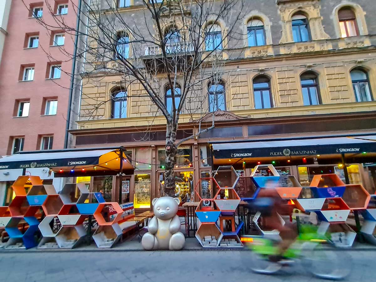A Púder Bárszínház nemcsak a Ráday utca, de egész Budapest egyik leglátványosabb vendégtere is. Teraszidőben már kívülről is extravagáns, tarka kaptárminta-installációval és egy óriás mutáns, gumicukorra emlékeztető macival.
