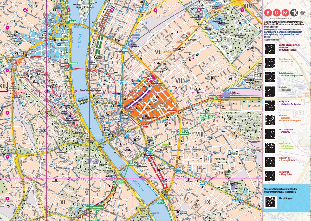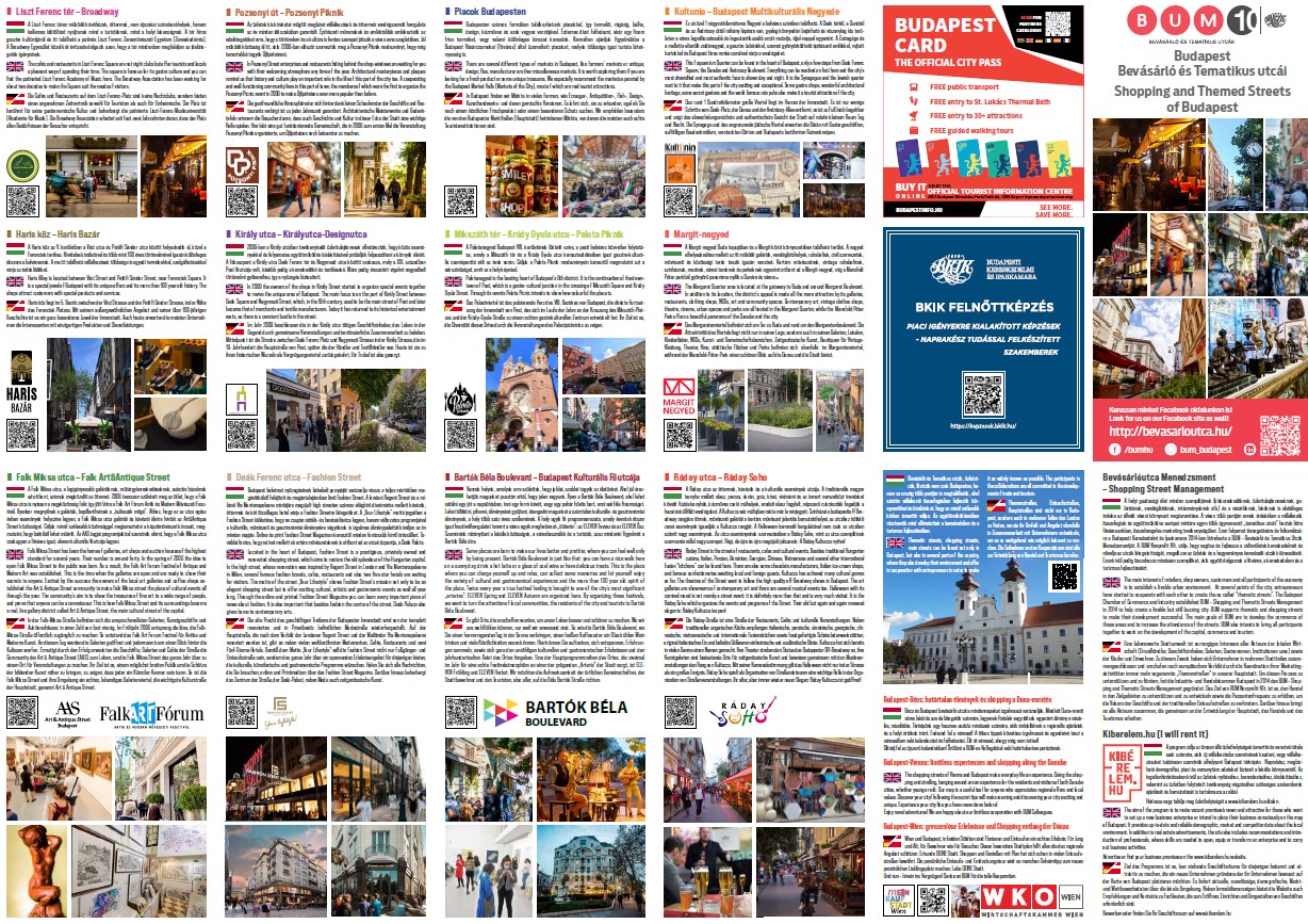 A tematikus utcák népszerűsítésére és az idelátogató turisták számára mintegy alternatív program lehetőséget kínálva született meg a BUM térkép. Közel 1,35 millió példányban jelent meg ez az ingyenes kiadvány eddig. Tavaly már megújulva debütált és idén frissítettük tartalmát. Az egyik oldalon Budapest térkép jelenik meg feltüntetve utcáinkat és partnereinket, másik oldalon pedig a leírások és tájékoztatók szerepelnek, mind az utcákról, mind partnereinkről három nyelven (magyar-angol-német). A térképek terjesztésében a Budapesti Brand Nonprofit Zrt. a fő partnerünk, így mind a budapest infó ponton, mind kiemelt rendezvényeken is megjelenik a kiadvány. Ezenkívül 350 Budapesti display helyre is kikerül (orvosi rendelőkbe, autó szalonokba, fitnesztermekbe stb.). Természetesen az utcákban a vállalkozásoknál is megtalálhatók majd a kiadványok.