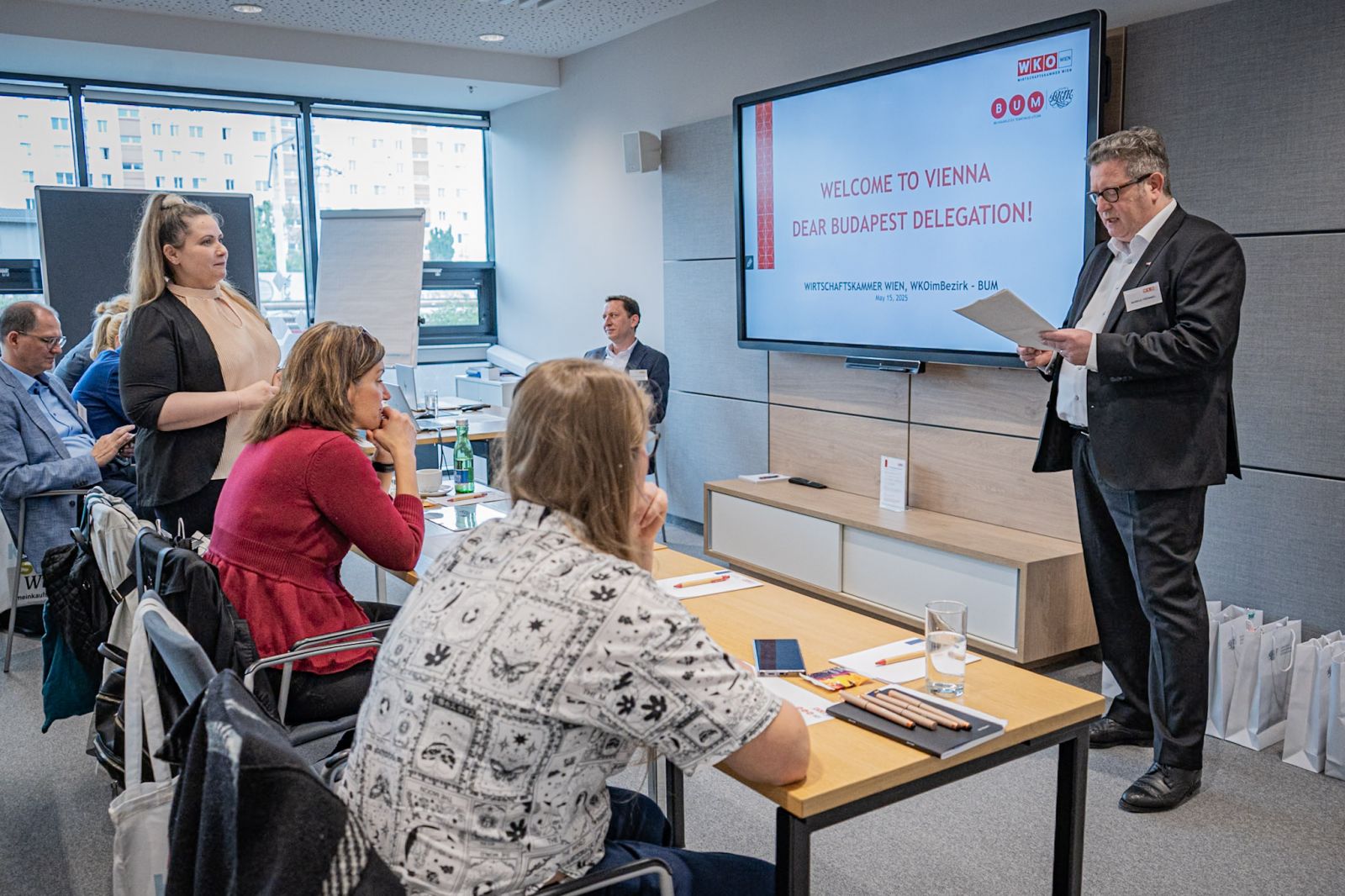 The day began with an exciting joint train ride, as public transport in the city of Vienna is the best way to get from one place to another. One of our old contacts, Kovács Balázs (GD Consulting), awaited us at the station, along with Dora Marta Kovac and Monika Rommer from the WKO Bezirk. They accompanied us to one of the WKO's headquarters near Prater. This is a truly impressive office building where we could hold our presentations in a well-equipped, spacious, bright room. Manfred Sussitz, Claudia Grabner, and Markus Frömmel welcomed us at the venue. Markus Frömmel even personally welcomed the team in Hungarian. After that, the Hungarian side introduced itself briefly.