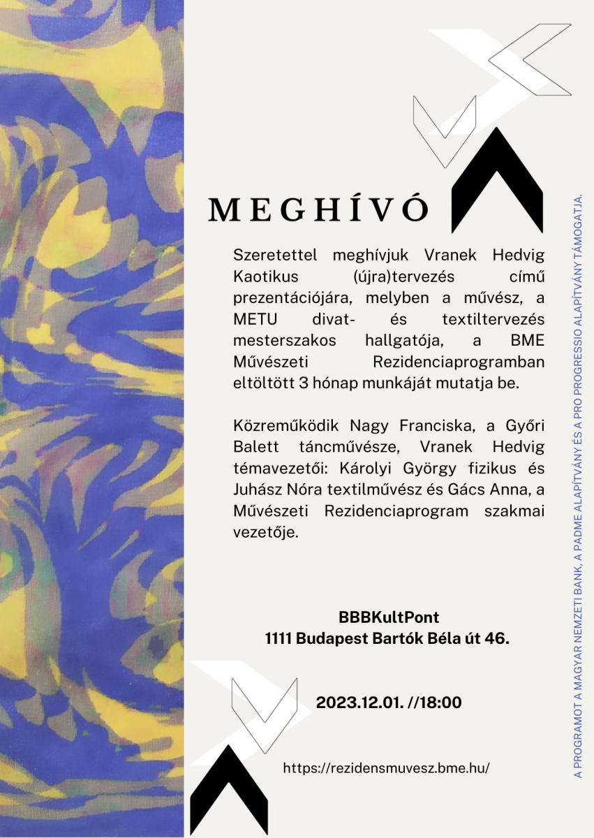 Szeretettel várunk minden érdeklődőt Vranek Hedvig Kaotikus (újra)tervezés című prezentációjára, melyben a művész, a METU divat- és textiltervezés mesterszakos hallgatója, a BME Művészeti Rezidenciaprogramban eltöltött 3 hónap munkáját mutatja be.