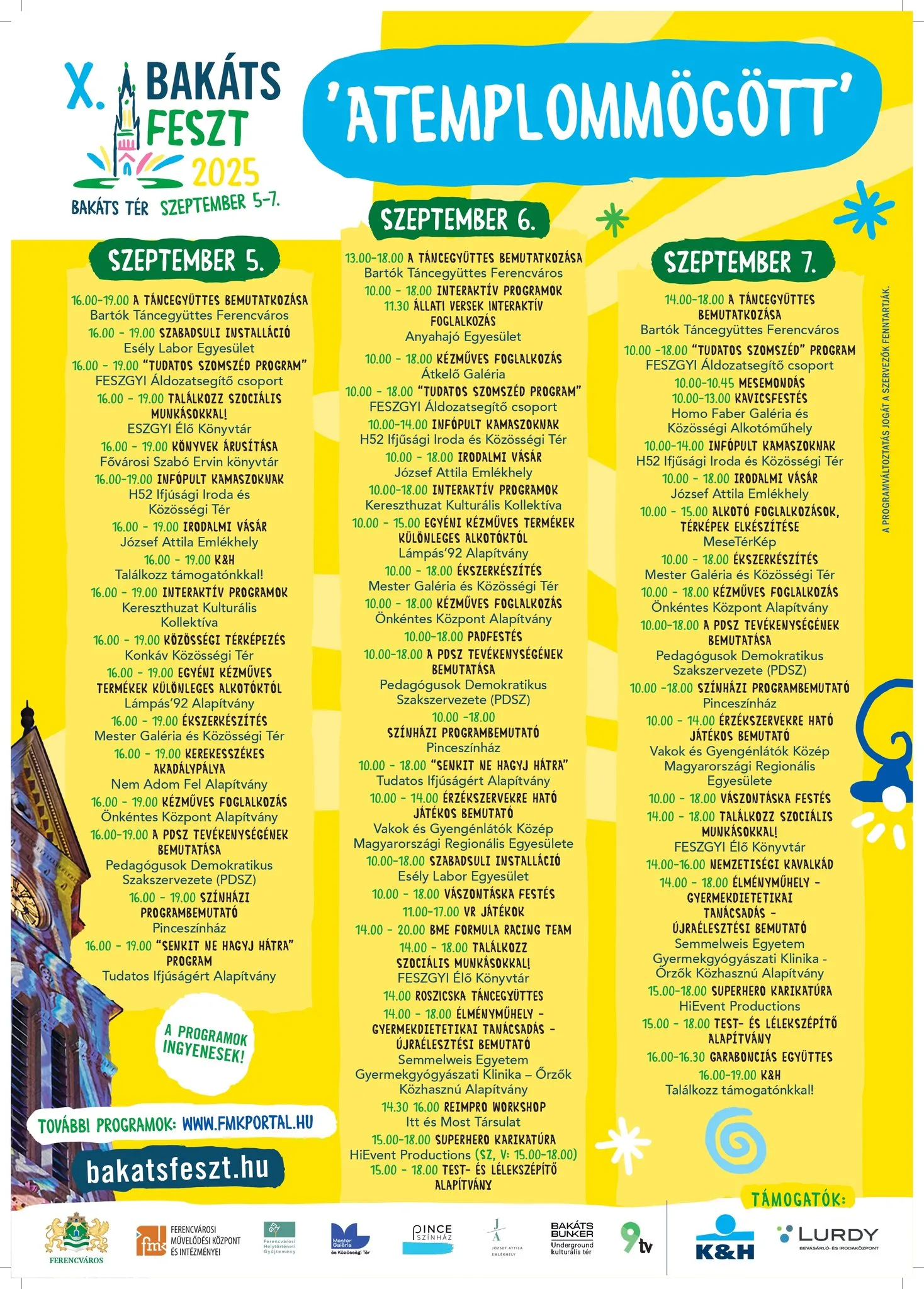 Koncertek, gyerekprogramok, kiállítások, irodalmi beszélgetések és helytörténeti séták a Bakáts téren.